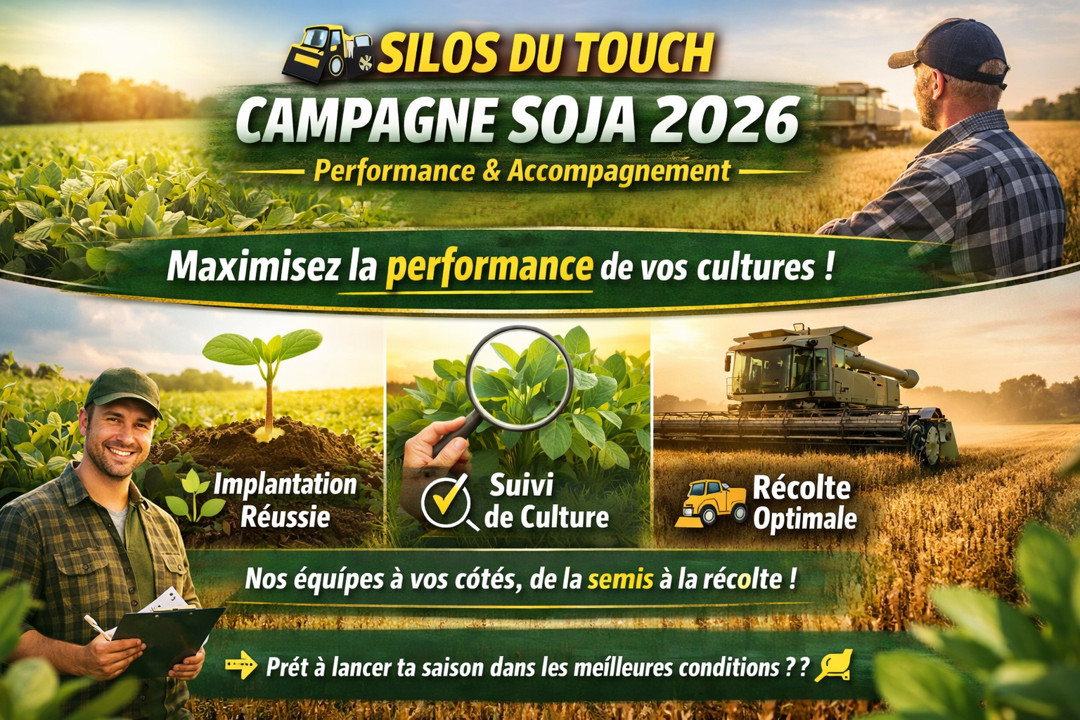 🚜 Silos du Touch lance officiellement la campagne soja 2026 Avec un objectif clair 💡 👉 Maximiser la performance de tes cultures, de l’implantation à la récolte. 🤝 Un accompagnement de A à Z Nos équipes sont mobilisées à chaque étape : ➡️ Implantation ➡️ Suivi des cultures ➡️ Récolte 🎯 Des résultats au cœur de la stratégie Grâce à un accompagnement technique de proximité : ➡️ Sécurisation de l’itinéraire cultural ➡️ Optimisation des rendements ➡️ Sérénité tout au long de la saison 🌾 🔥 En résumé : La campagne soja 2026 avec Silos du Touch, c’est performance, expertise et accompagnement sur mesure. 👉 Prêt à lancer ta saison dans les meilleures conditions ? 🌱 #CampagneSoja2026 #Soja #Agriculture #PerformanceAgricole #SilosDuTouch #AccompagnementAgricole #ExpertiseTerrain #Implantation #SuiviCultural #Récolte #Rendement #Cultures